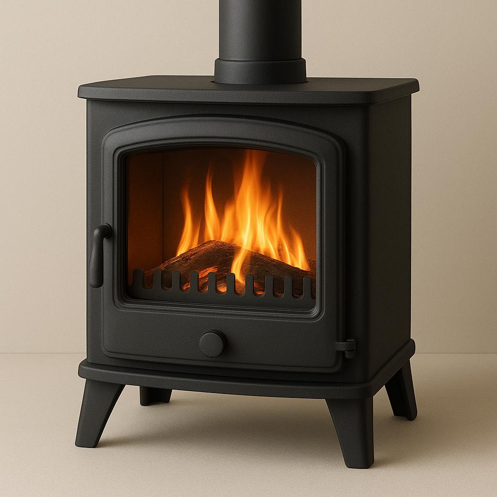 Poêle en acier, rendement supérieur à 75%, adapté aux surfaces jusqu’à 50 m². Compatible bûches de 25 à 33 cm, sortie fumées 150 mm.